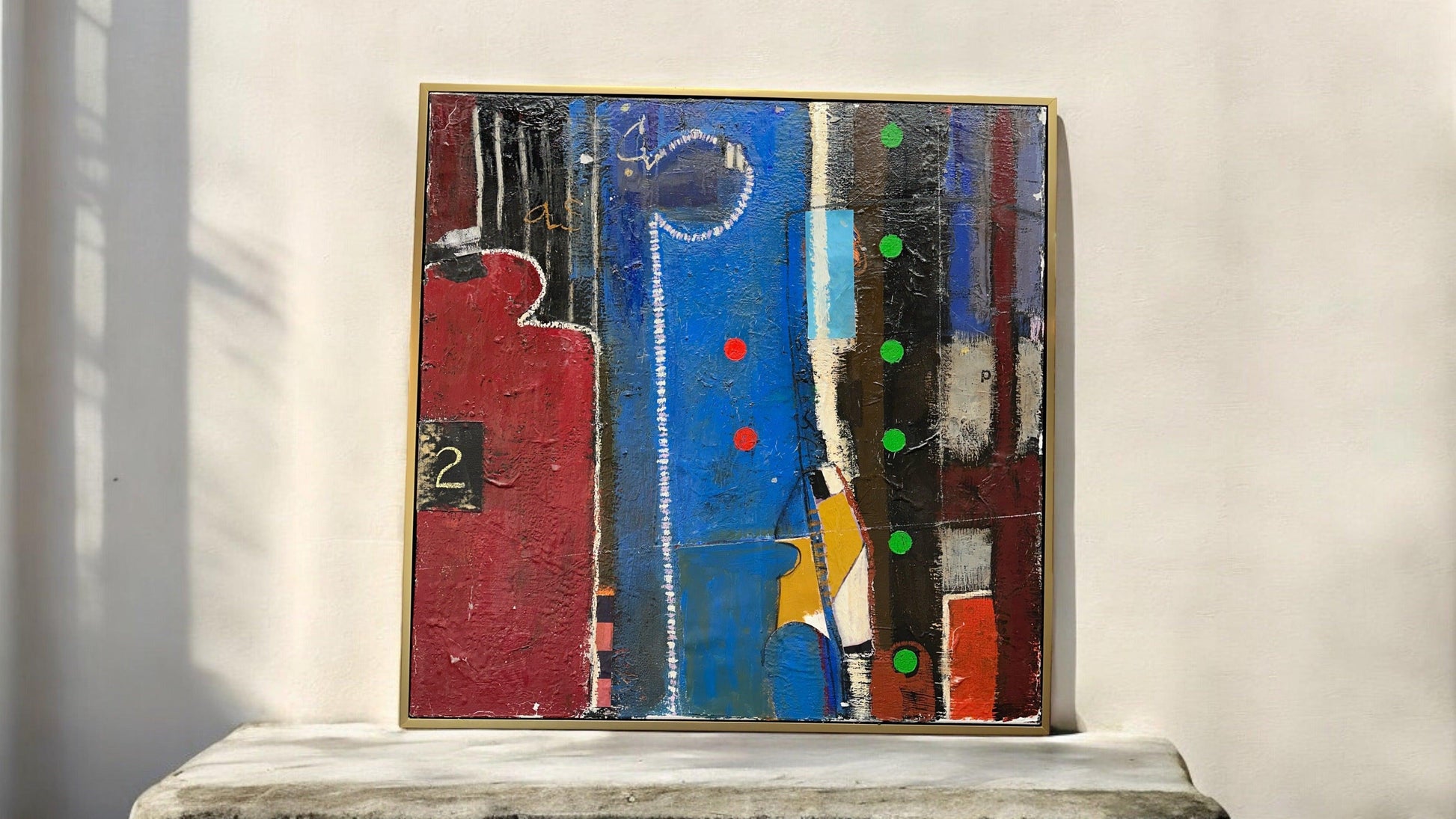 This Abstract 2 Collage on Canvas is a captivating piece, featuring a unique encaustic abstract design with a custom frame. Measuring 37 x 37 inches, this artwork is a stunning addition to any space. Elevate your interior design with this one-of-a-kind statement piece.