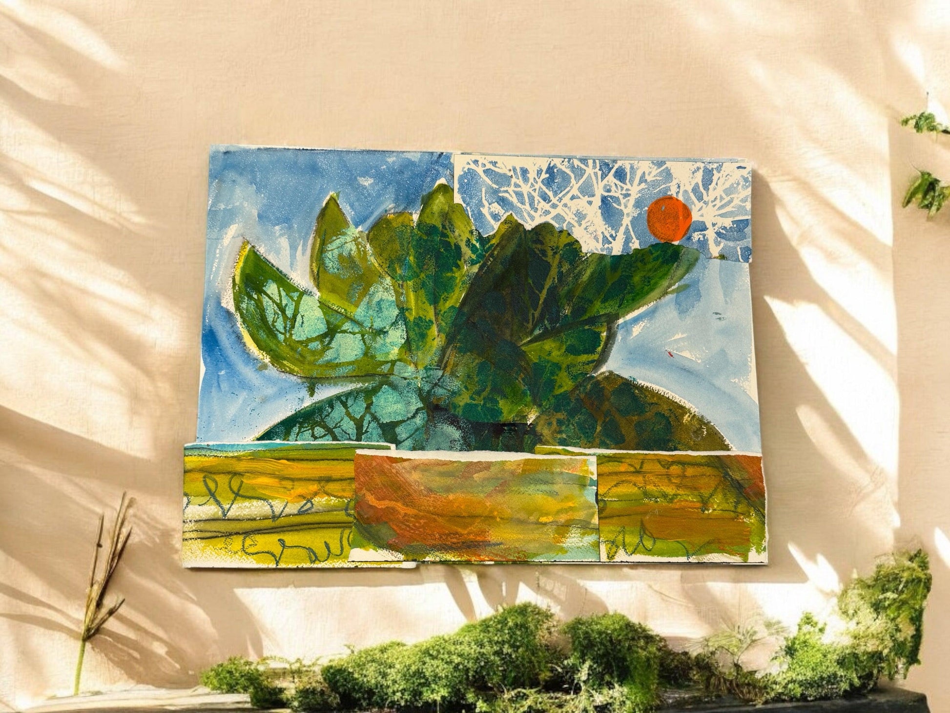 Expertly crafted by renowned artist Reed, this beautiful mixed media piece showcases the vibrant beauty of greens and blue in a natural texture. With stunning detail and a unique combination of materials, this artwork is ready to be framed and admired. A must-have for any art lover or home decorator.