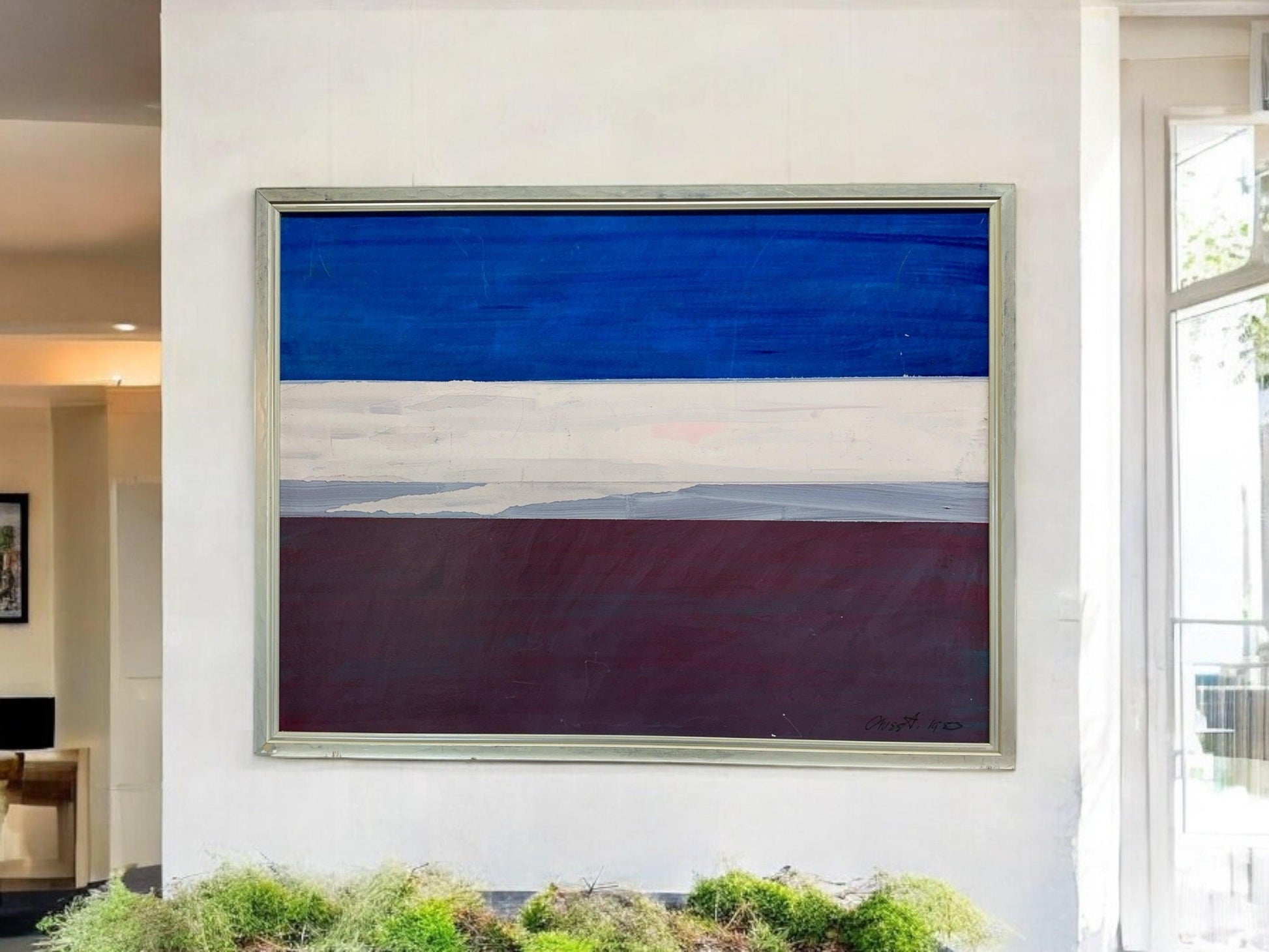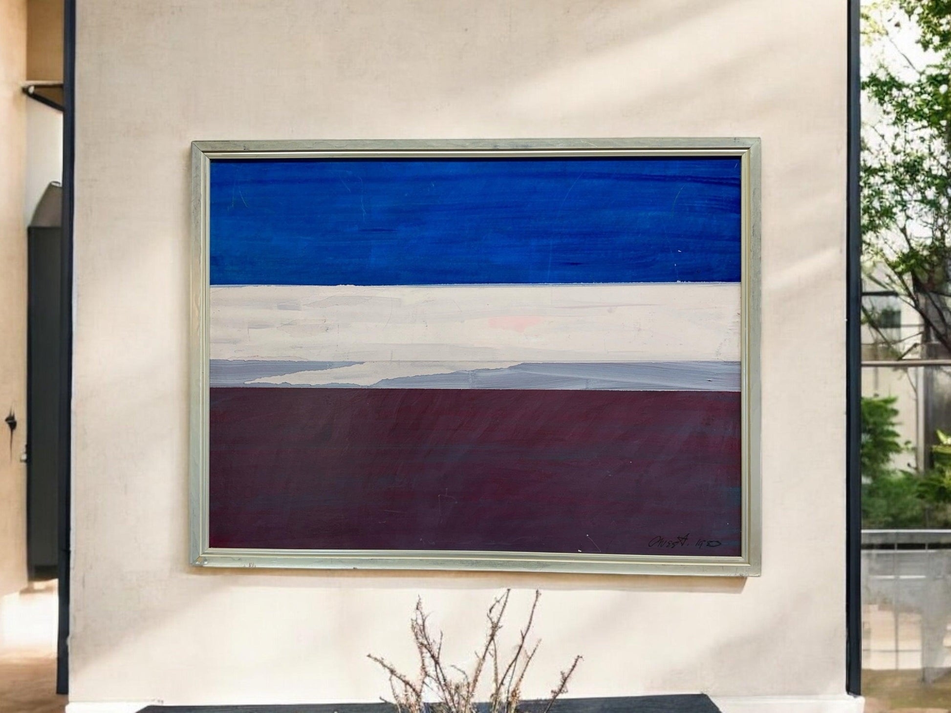 This mixed media painting by artist Cross A is a unique and one-of-a-kind piece, numbered 1303. It has been expertly custom framed and measures 31 x 41 inches. Experience the intricate details of this captivating artwork, a must-have for any art enthusiast.