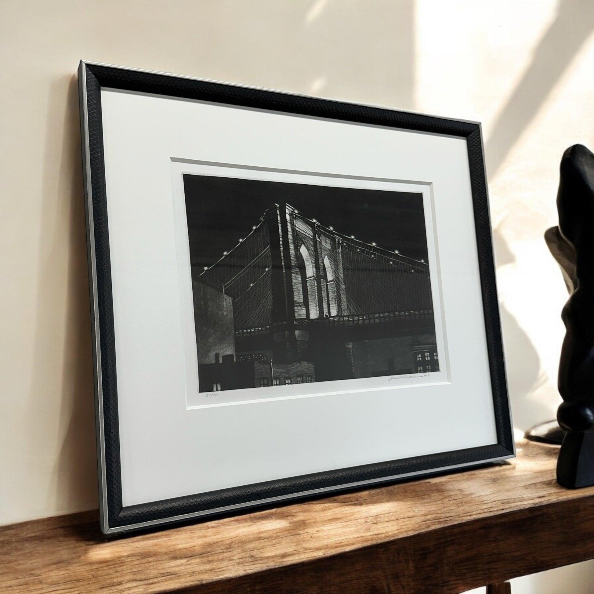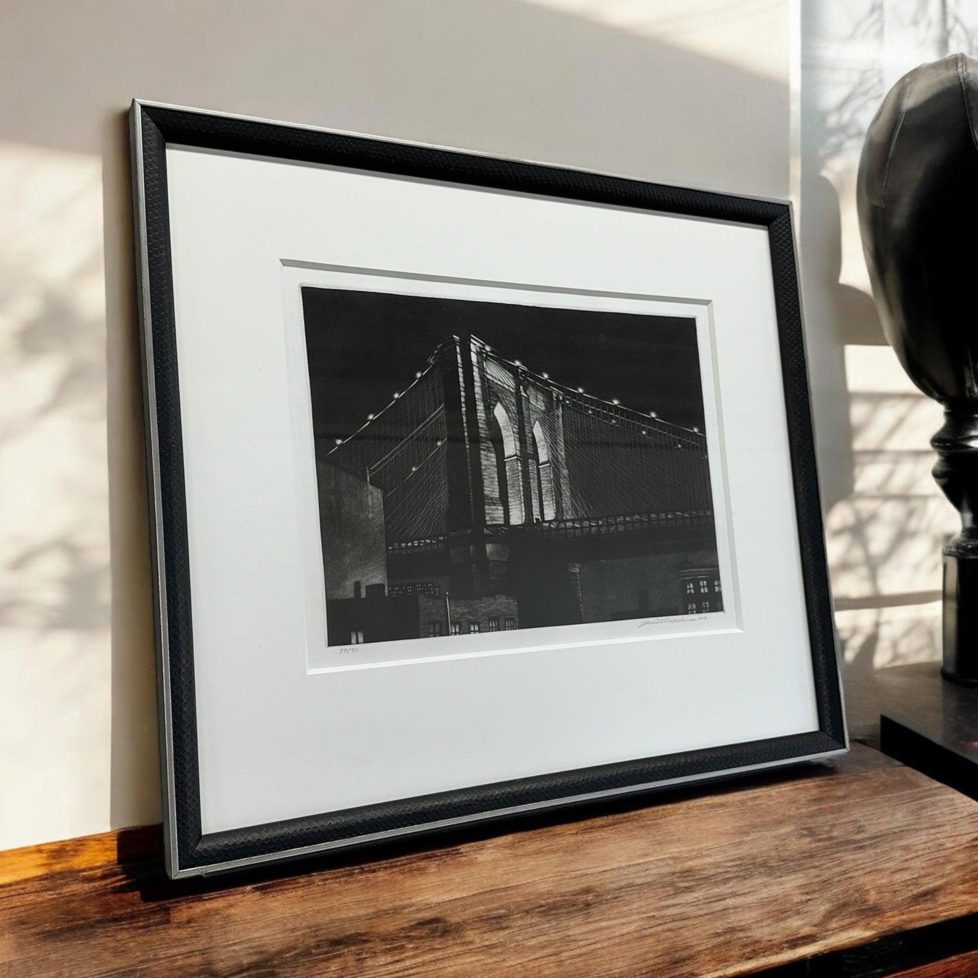The Brooklyn Bridge etching, #1367, is a must-have for collectors. Its custom frame measures 19 x 22", highlighting the intricate details and historical significance of this iconic landmark. Add a touch of sophistication to any space with this unique piece.