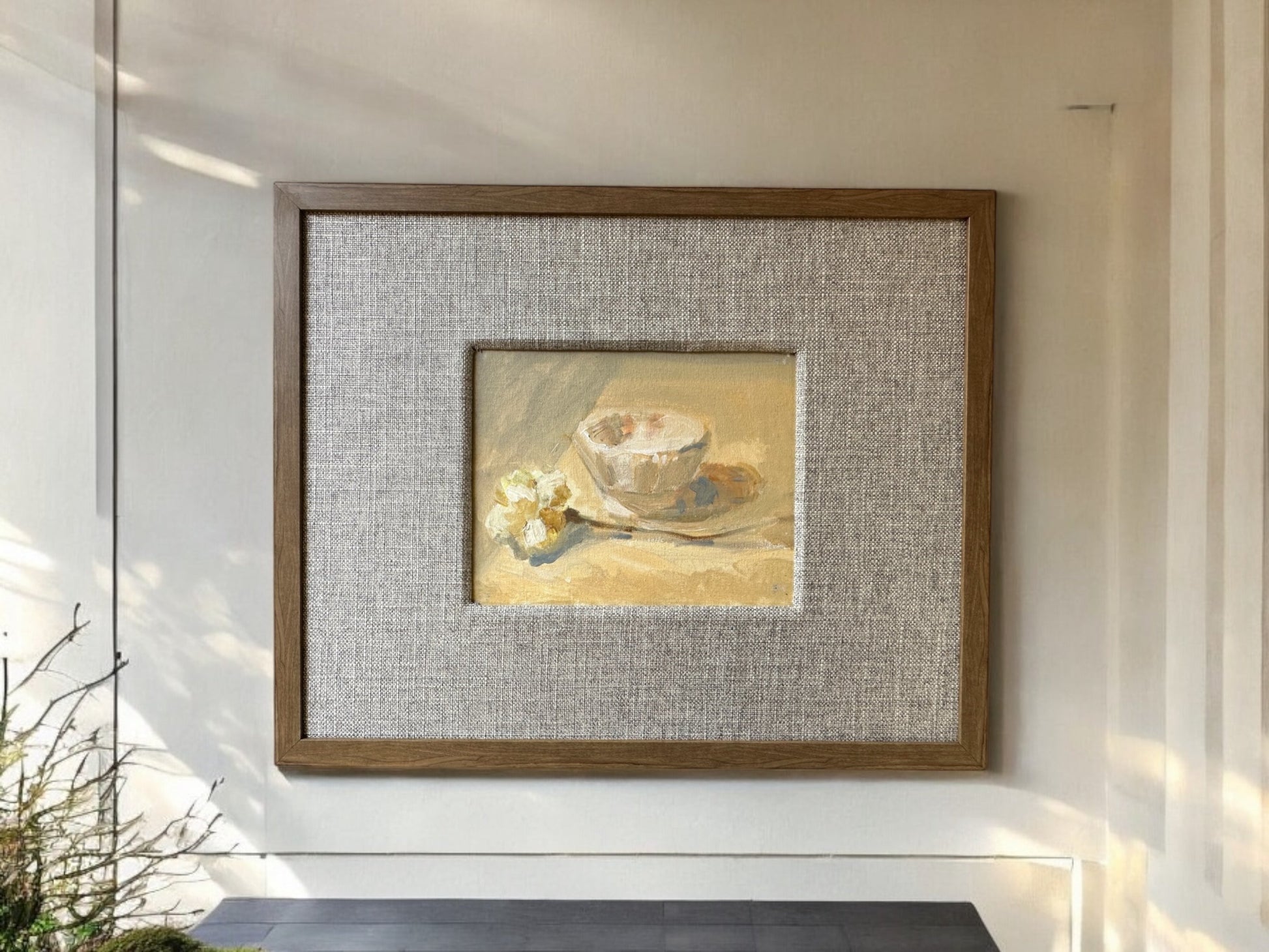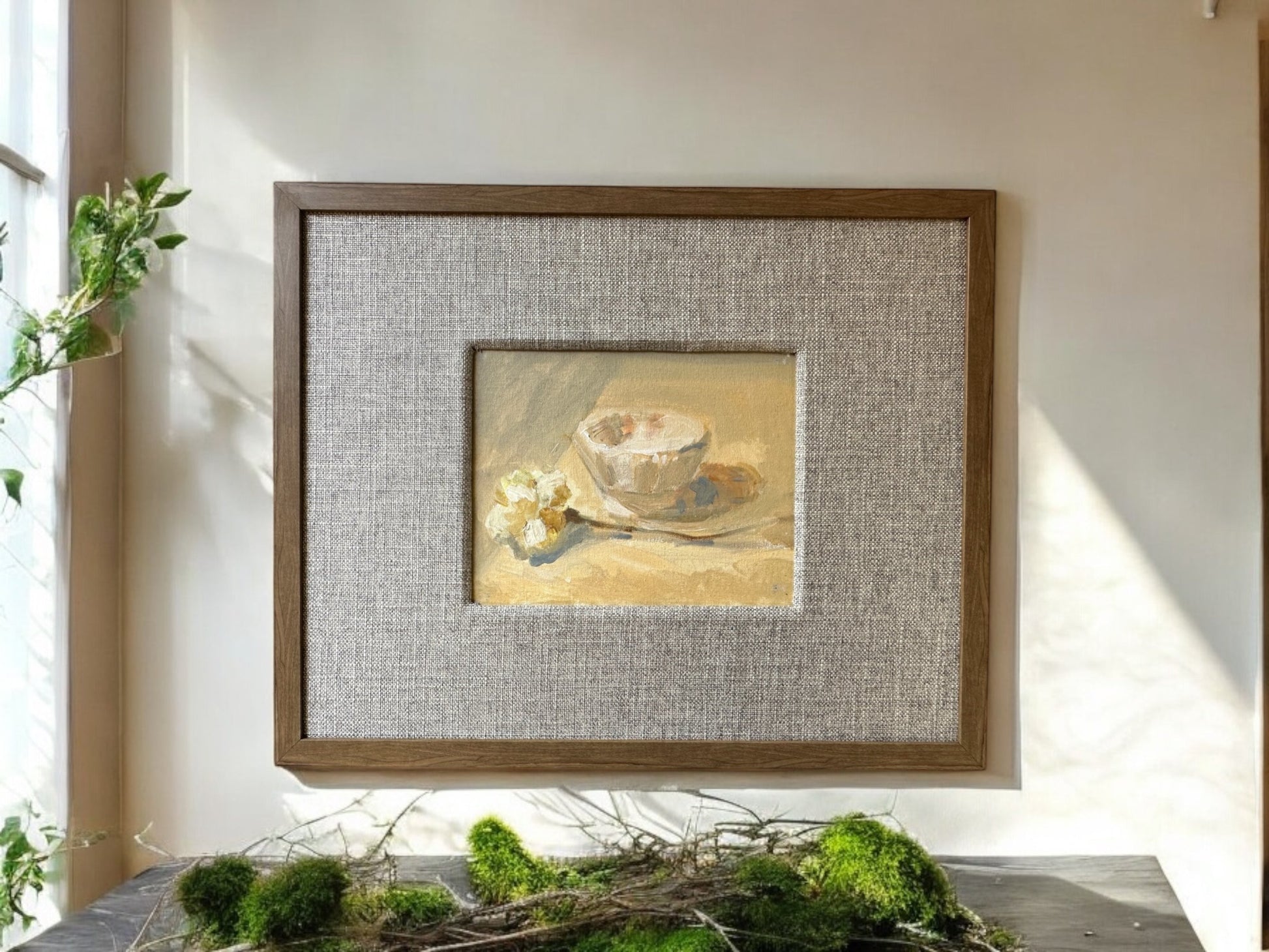 The Carnation & Cup oil painting, art number 1168, is beautifully displayed in a custom liner and wood frame measuring 17 x 21 inches. Adorn your walls with this stunning piece, adding a touch of elegance to any room.