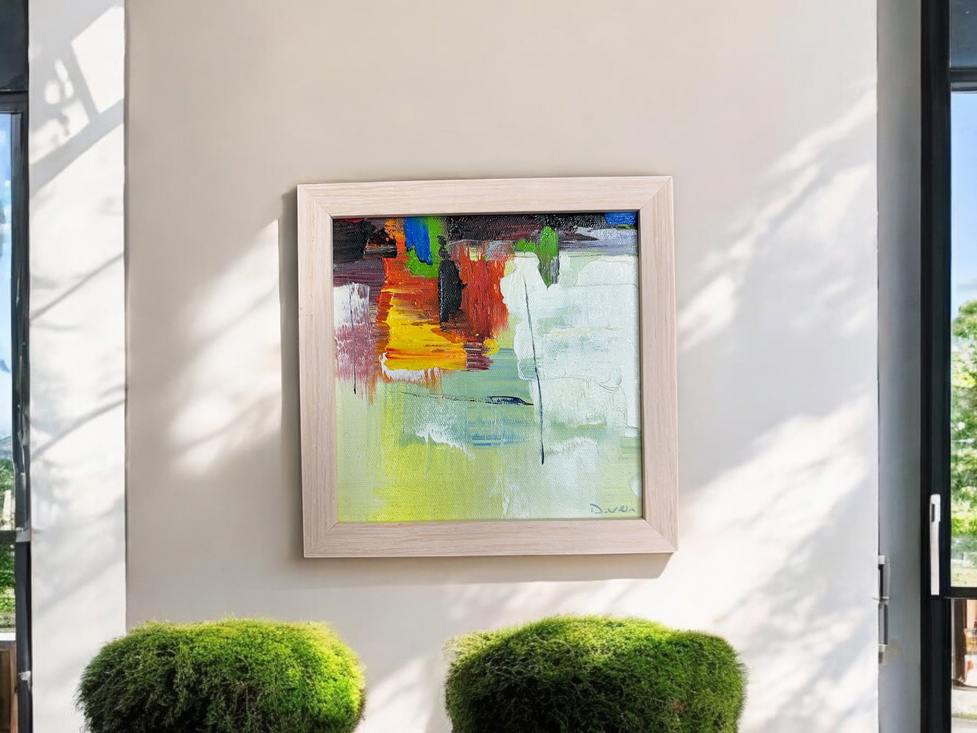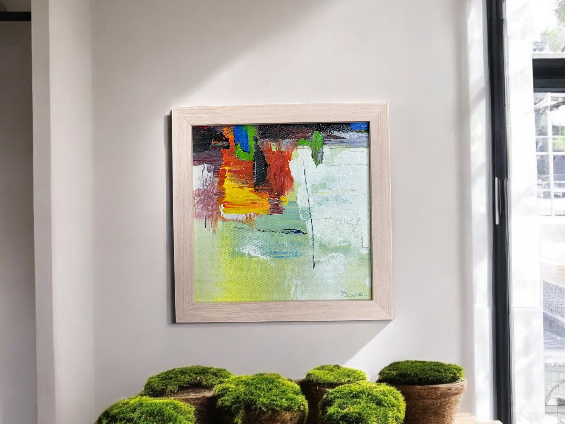 Expertly crafted and uniquely designed by renowned artist Daniel Van Osten, this mixed media piece is a stunning addition to any space. Measuring 9x9 inches and presented in a custom frame, it can be easily displayed on a wall or placed on a surface. With its vibrant colors and expert use of mixed media techniques, this piece is sure to make a statement and add a touch of elegance to any room.
