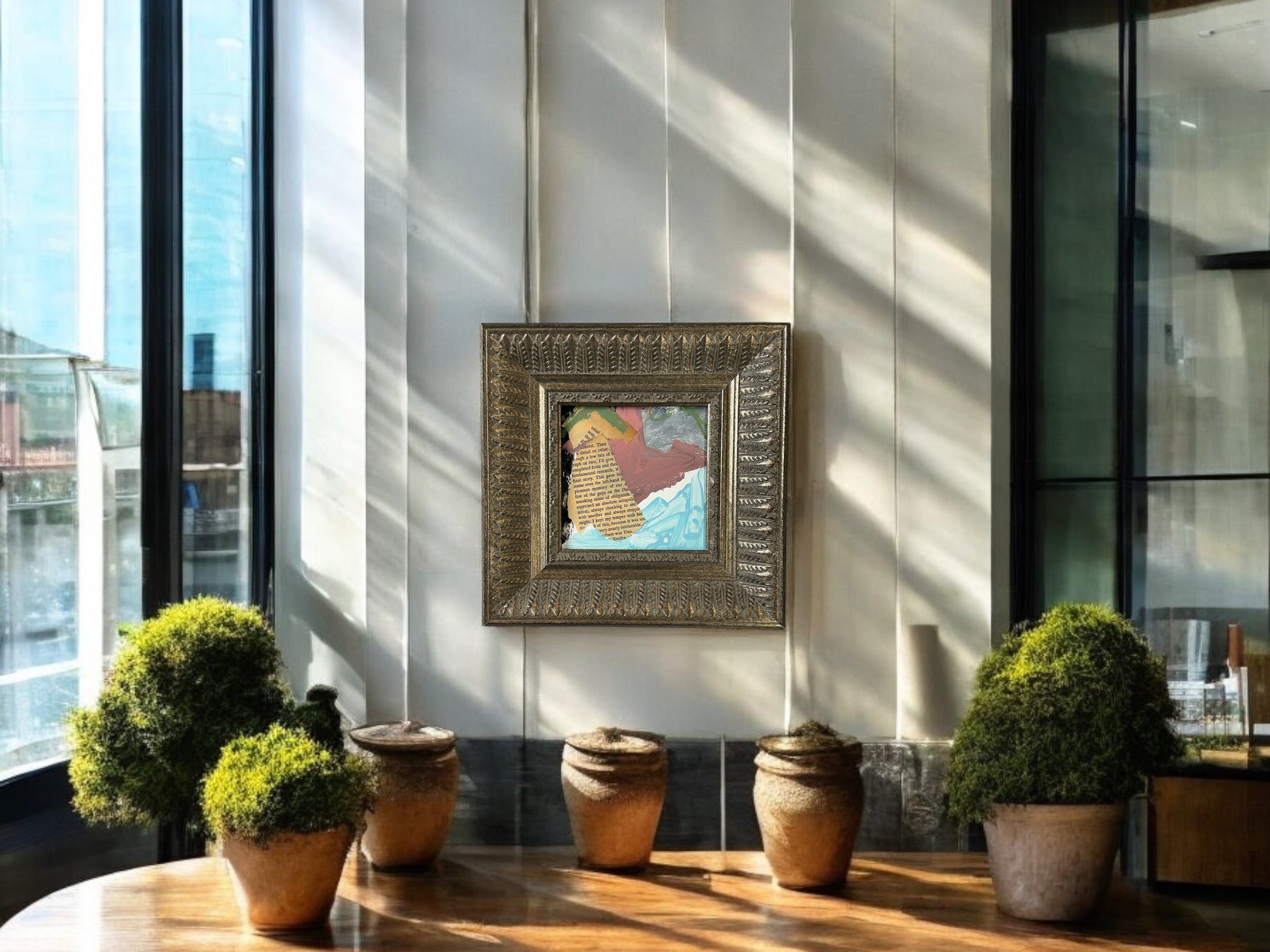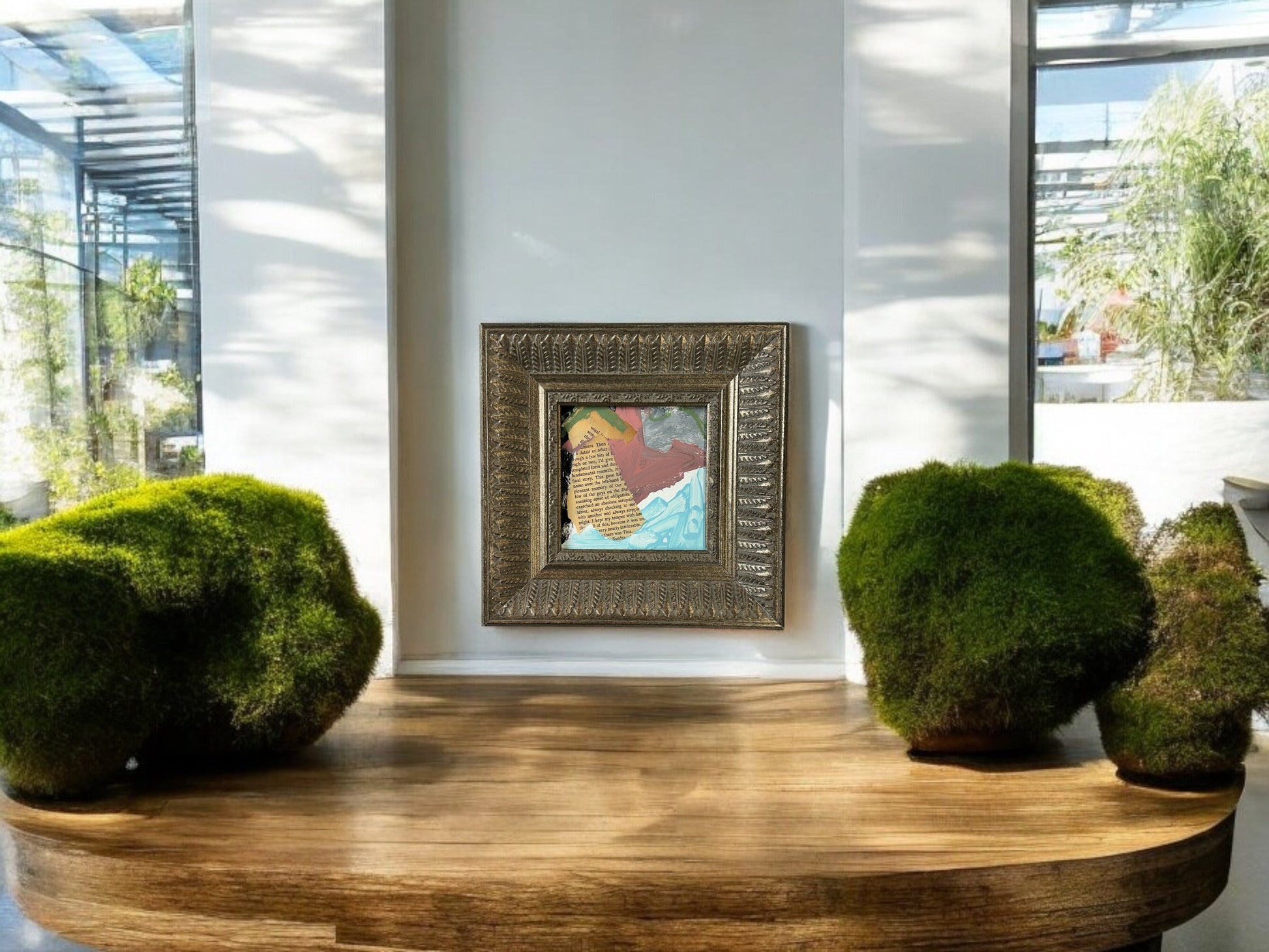 Introducing the Current Trends Series - DVO - #1007. This stunning collage on canvas utilizes mixed media for a unique, dynamic piece of art. The custom hand made ornate frame, measuring 9 x 9 inches, adds a touch of sophistication. Bring a modern touch to any room with art number 1007.