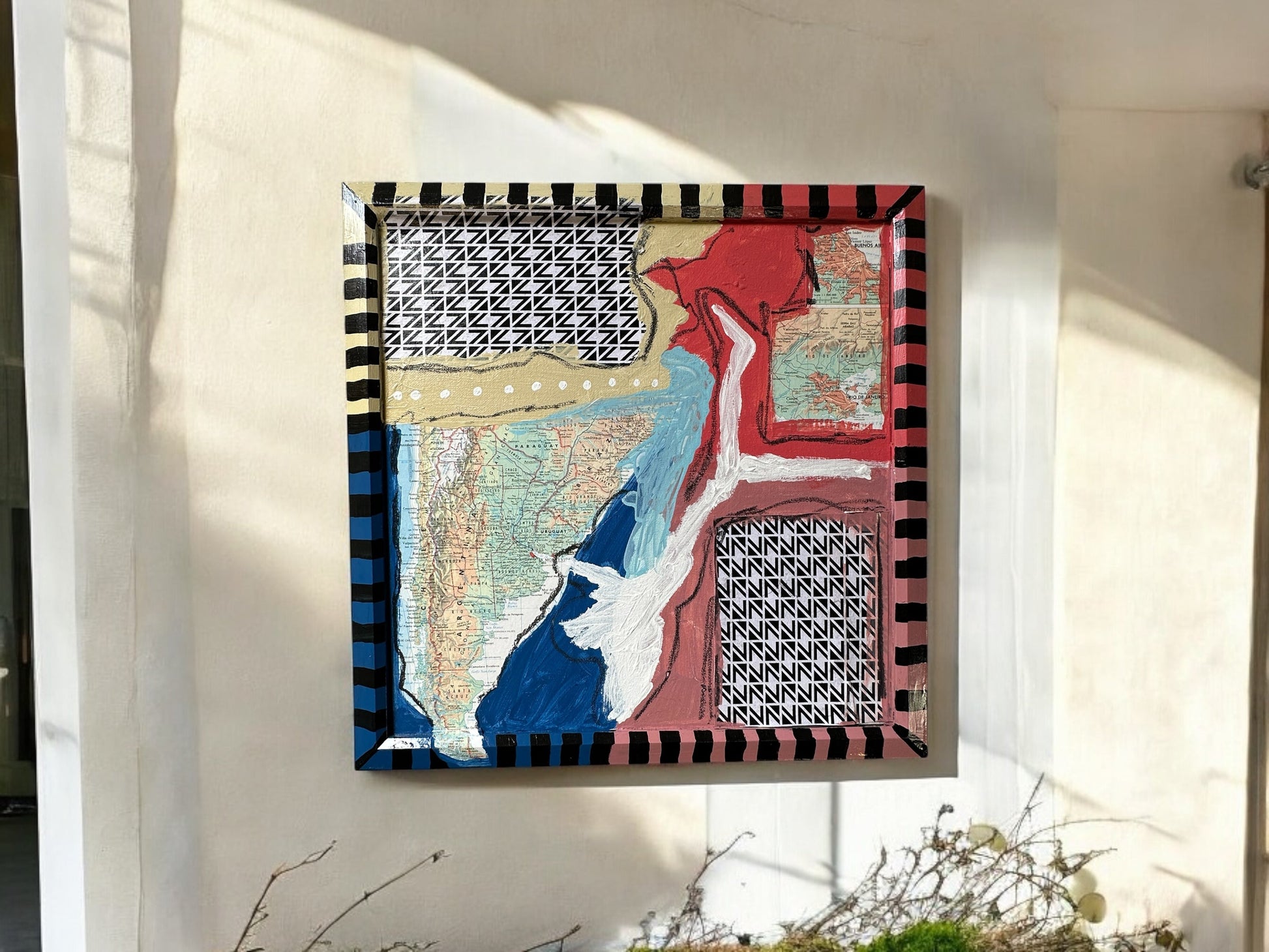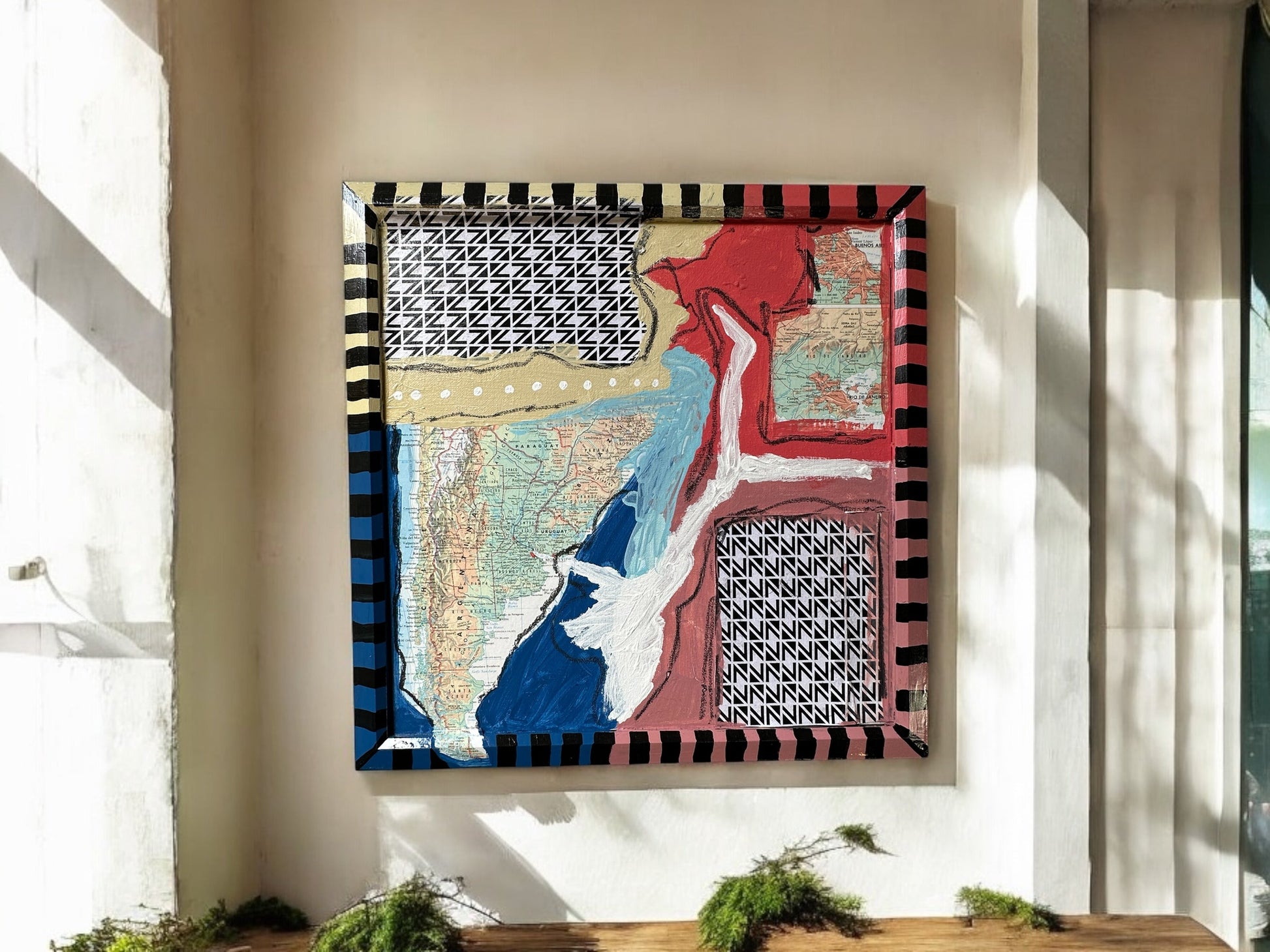 Introducing the Current Trends Series - DVO - #1088. This stunning collage on canvas utilizes mixed media for a unique, dynamic piece of art. The custom hand painted frame, measuring 15 1/2 x 15 1/2 inches, adds a touch of sophistication. Bring a modern touch to any room with art number 1088.