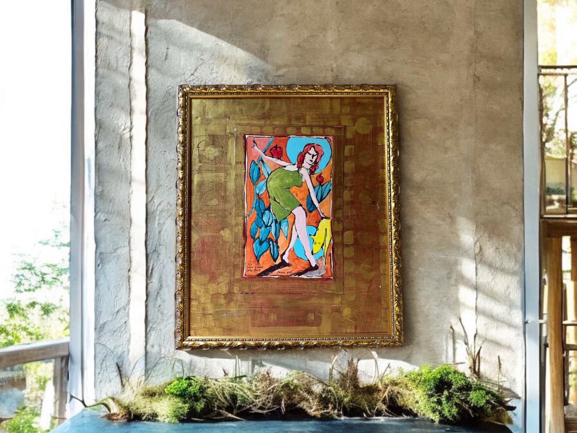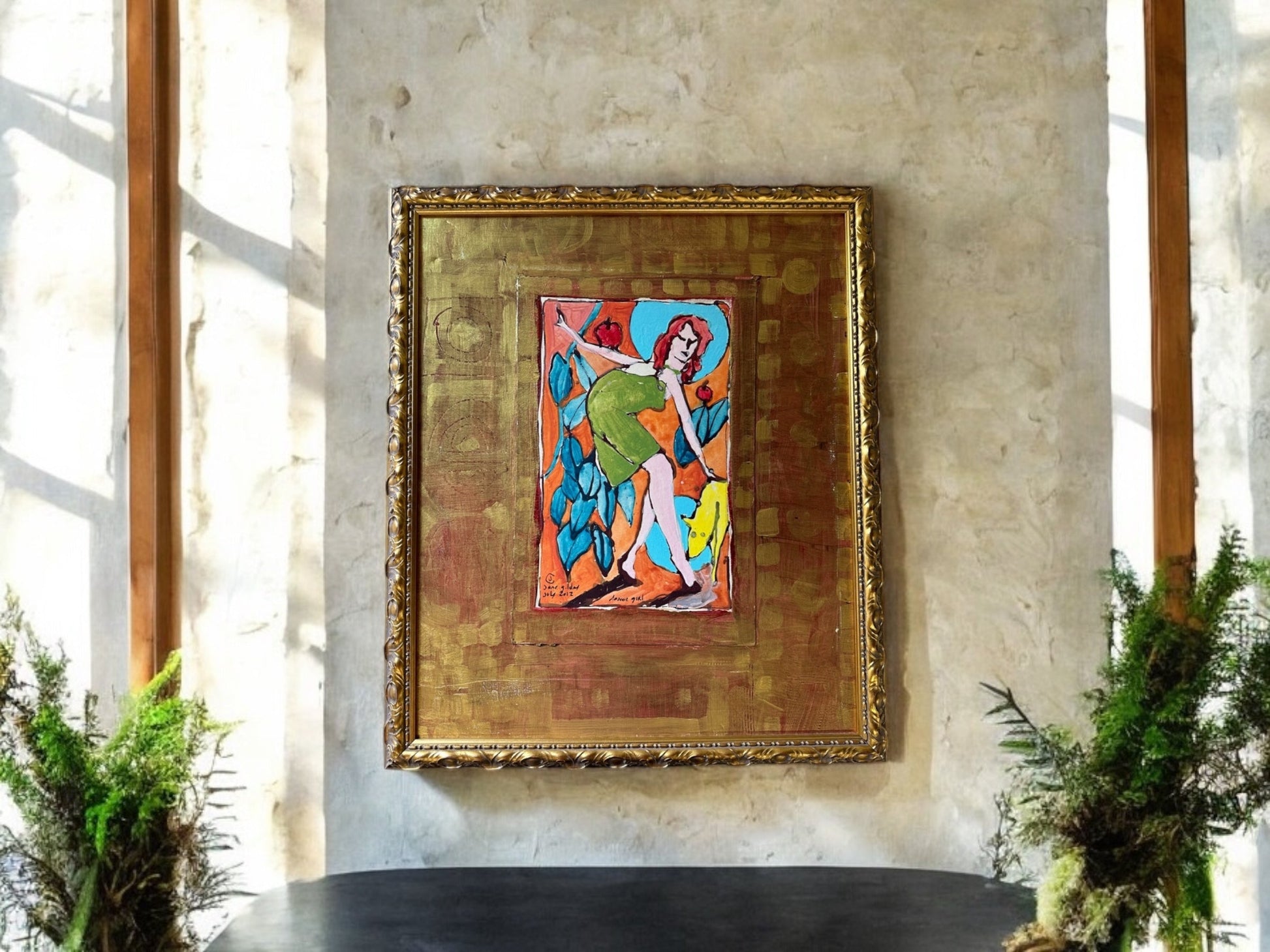 Experience the beauty of mixed media with "Dance Girl" by Jane Gilday. This stunning piece features intricate gold leaf accents and is displayed in a custom ornate gold frame, measuring 22 1/2 x 26 1/2 inches. Elevate any space with this unique work of art.