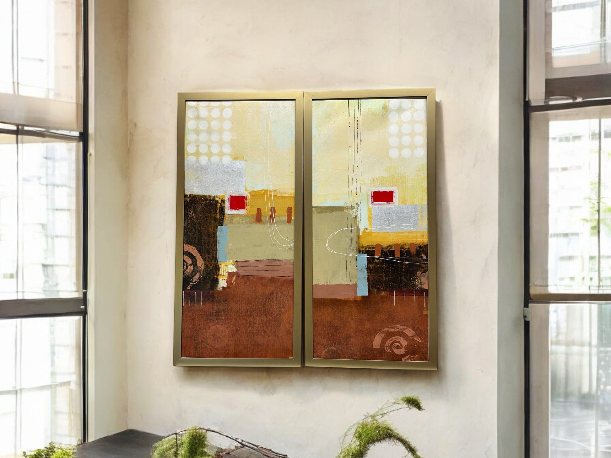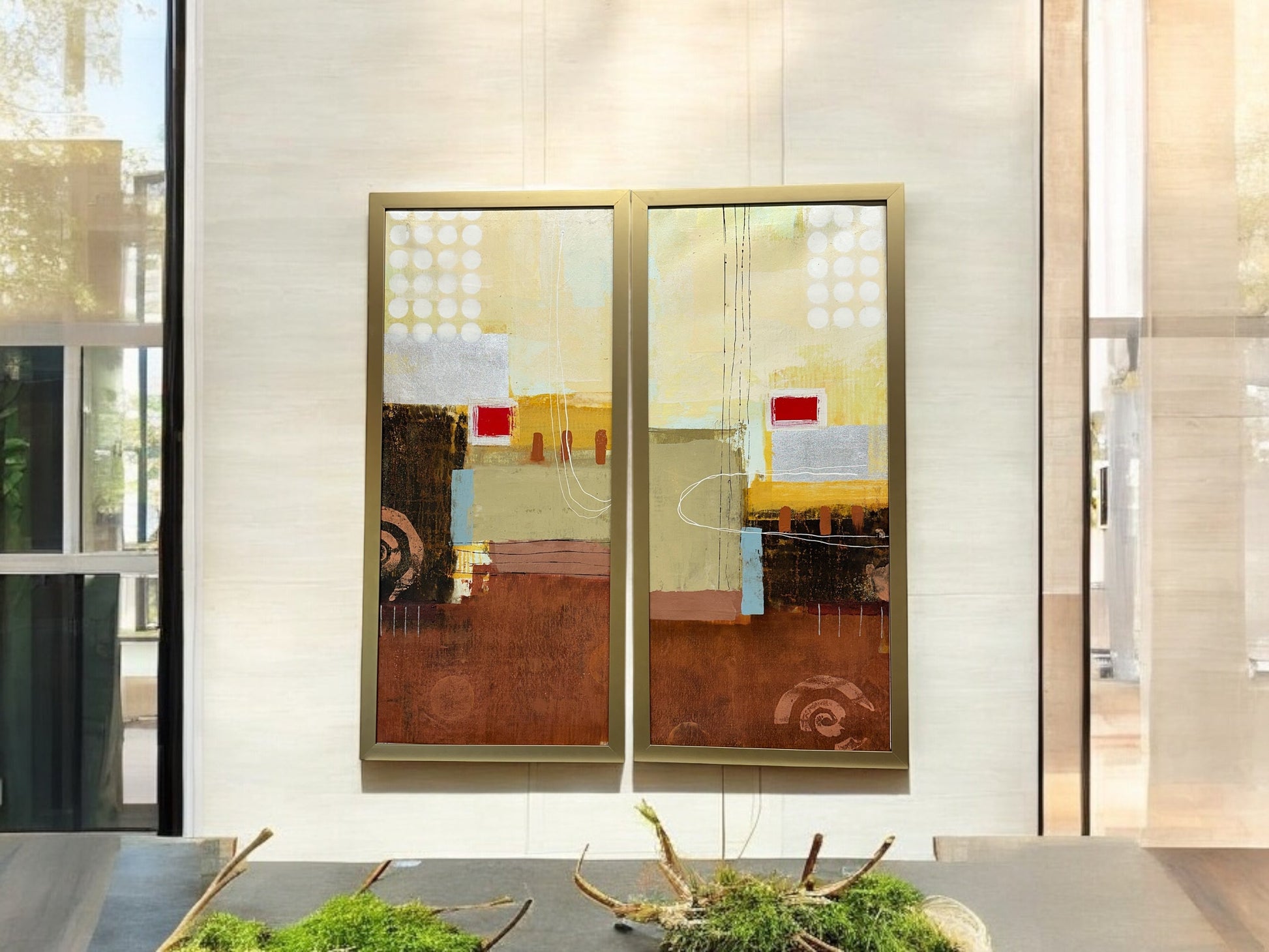 Experience the unique beauty of Mixed Media on canvas with Electric Pulse 1 & 2 - #1290. These custom framed pieces, measuring 18 1/2 x 40", will add a modern touch to any space. With its dynamic blend of textures and colors, this artwork is sure to impress.