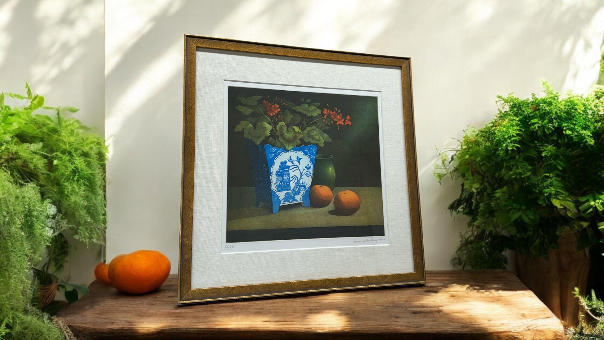 Add a touch of sophistication to your home with our Side Table Setting Lithograph. Featuring fresh oranges and potted plants, this custom-framed piece (number 1320) measures 19 x 19" and adds a pop of color to any room. The perfect addition for art collectors and interior design enthusiasts.