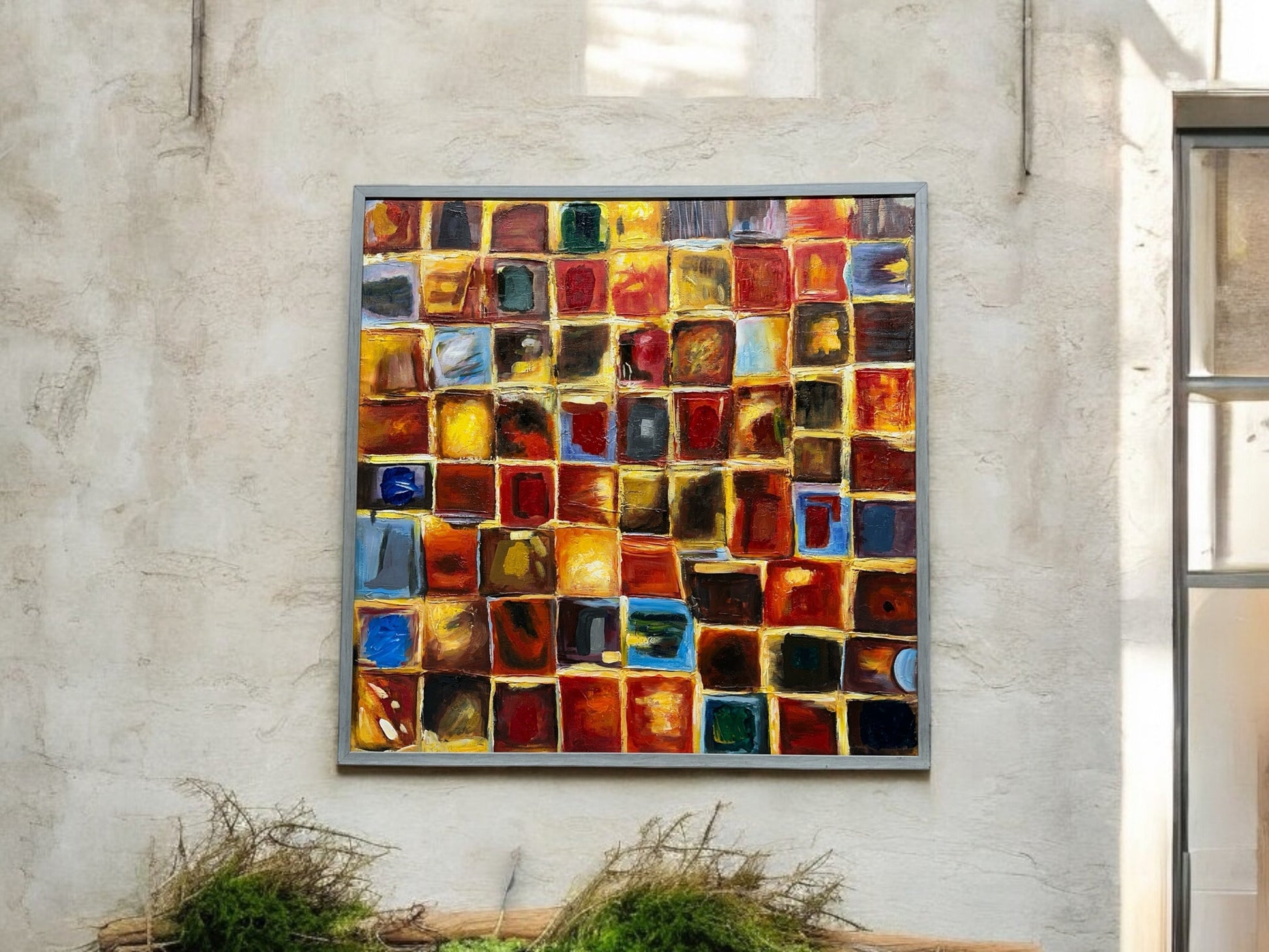 This custom framed oil on canvas, number 1291, measures 37 x 37 inches. As an industry expert, I can confidently say that this painting is a stunning addition to any collection. Its size and medium allow for a versatile display and its custom framing adds a touch of elegance.