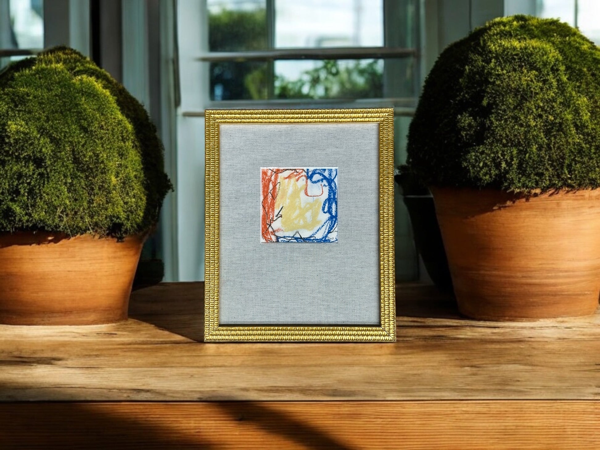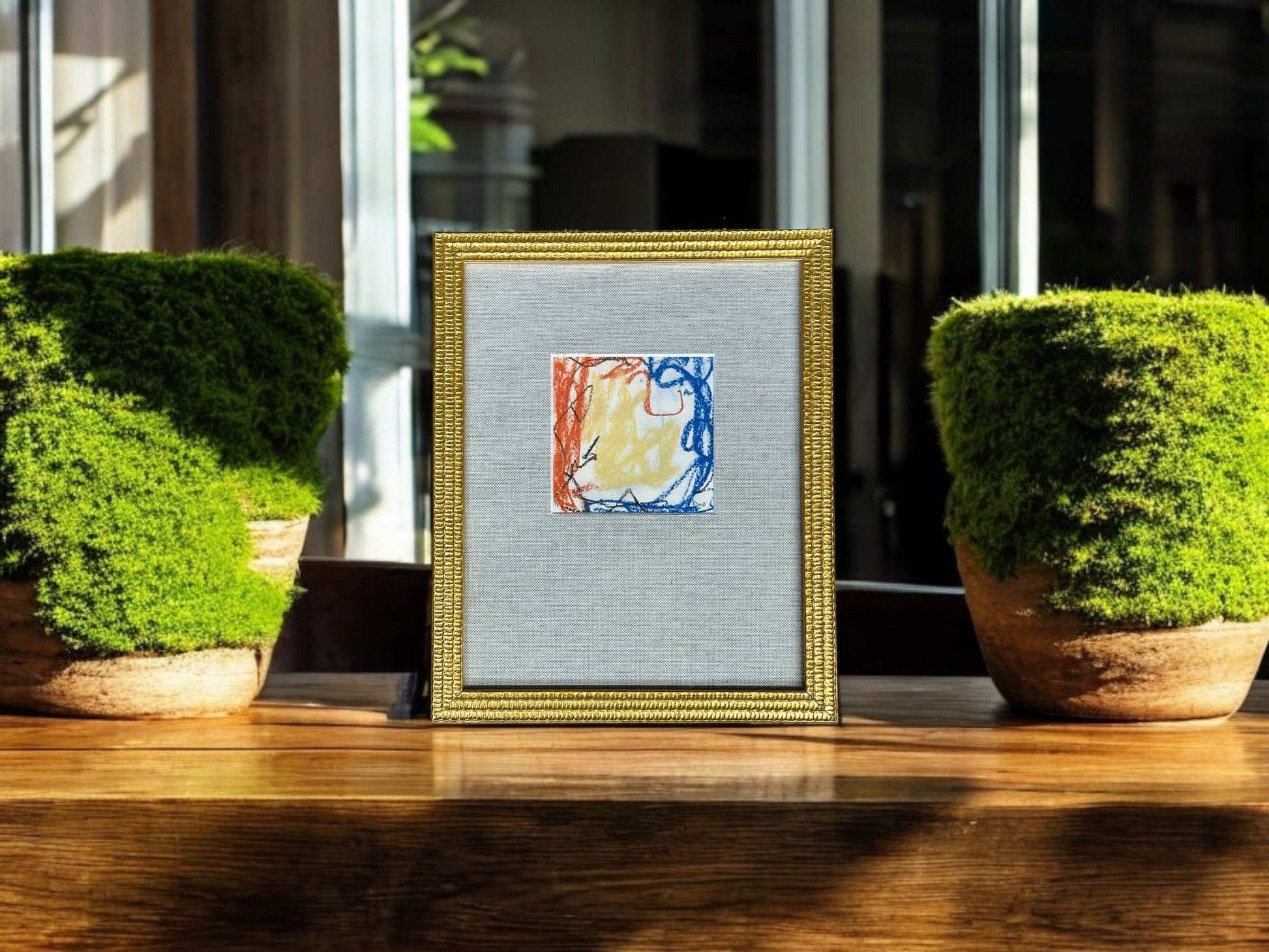 This pastel on paper art piece, professionally placed in a custom linen mat and gilded gold frame, offers a vibrant luster that will enhance any space. Measuring at 7x9'', this unique piece is sure to add an elegant touch to your home or office.