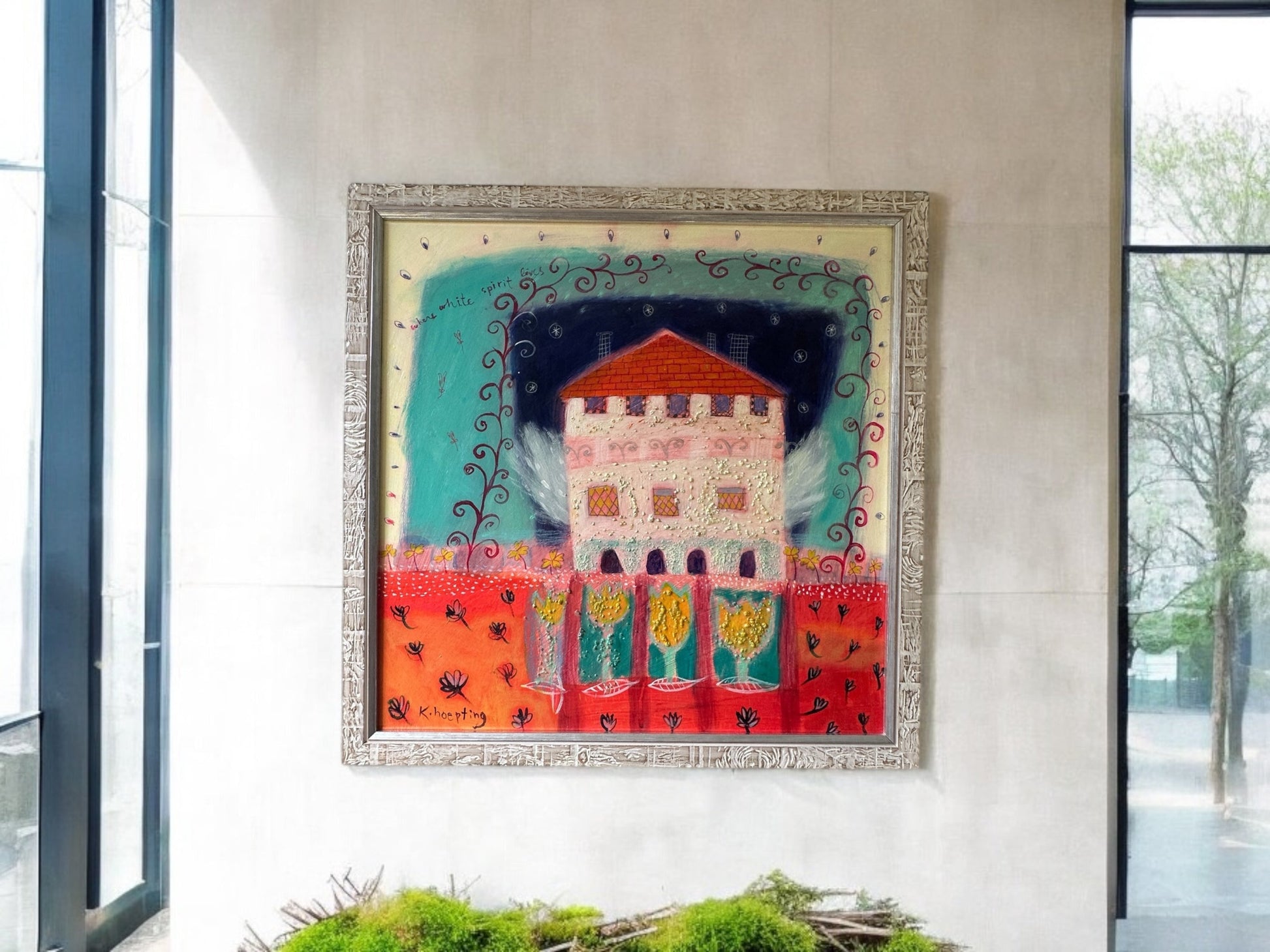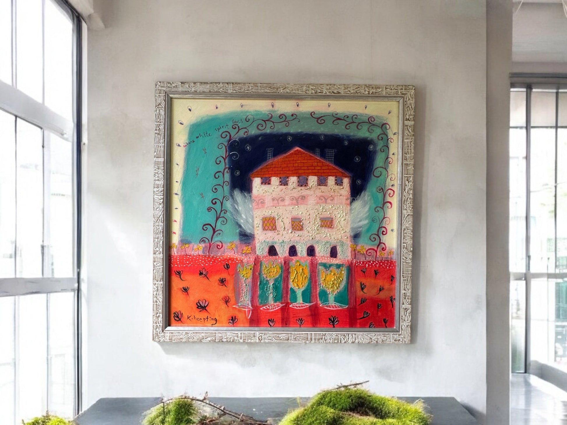 "Discover the ethereal world of "Where white spirit lives" with K. Hoepting's mixed media artwork, numbered 1211. This stunning piece, framed in custom wood, measures 17 1/2 x 17 1/2 inches, adding a unique touch to any space. Immerse yourself in this captivating piece that effortlessly blends various forms of art."