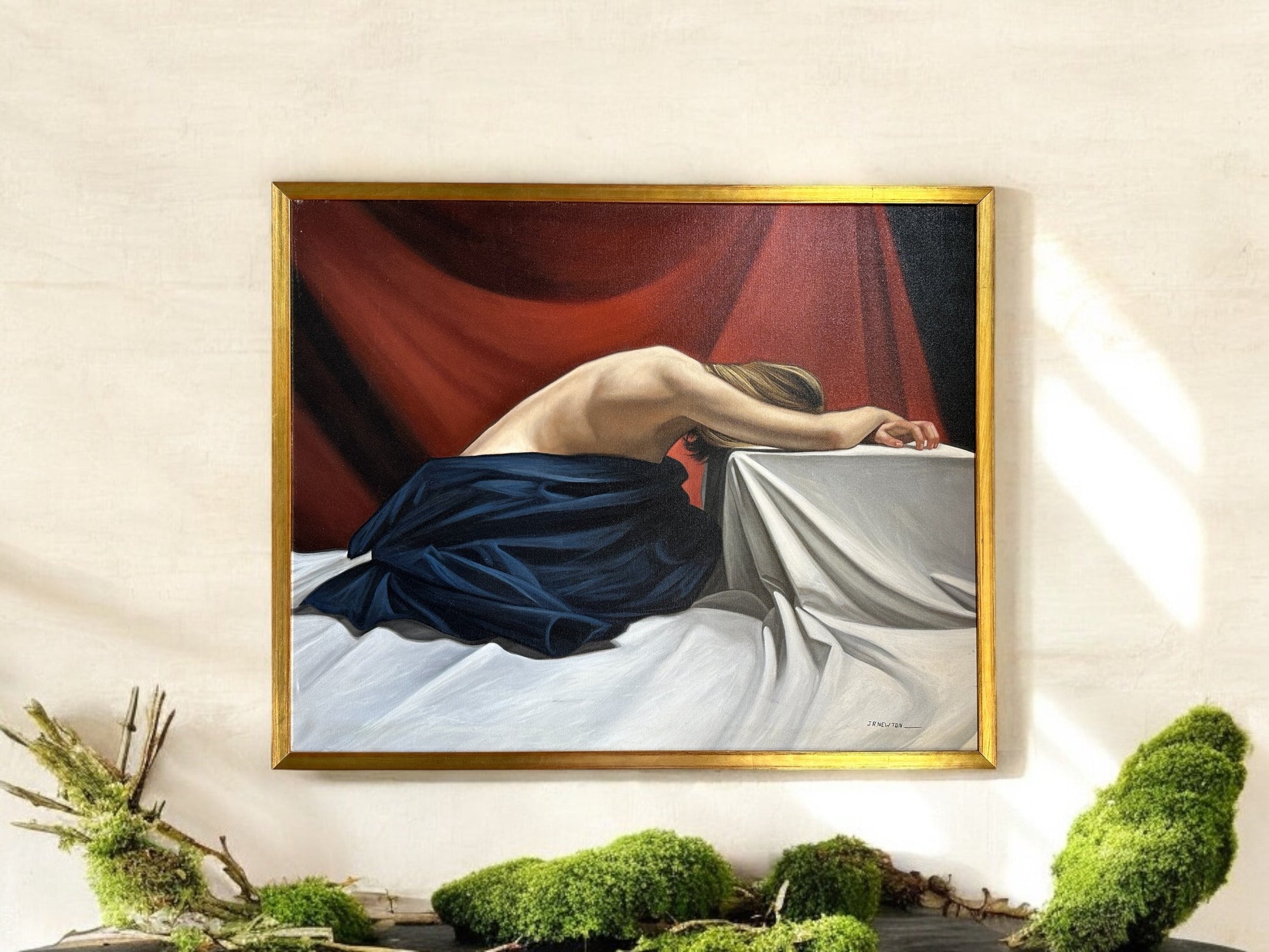 Discover the stunning art of J.R. Newton with this original oil on canvas piece, numbered 1235. Measuring 25 x 31 inches, it is elegantly framed in a custom gold frame. Enhance your home or office decor with this timeless and unique artwork.